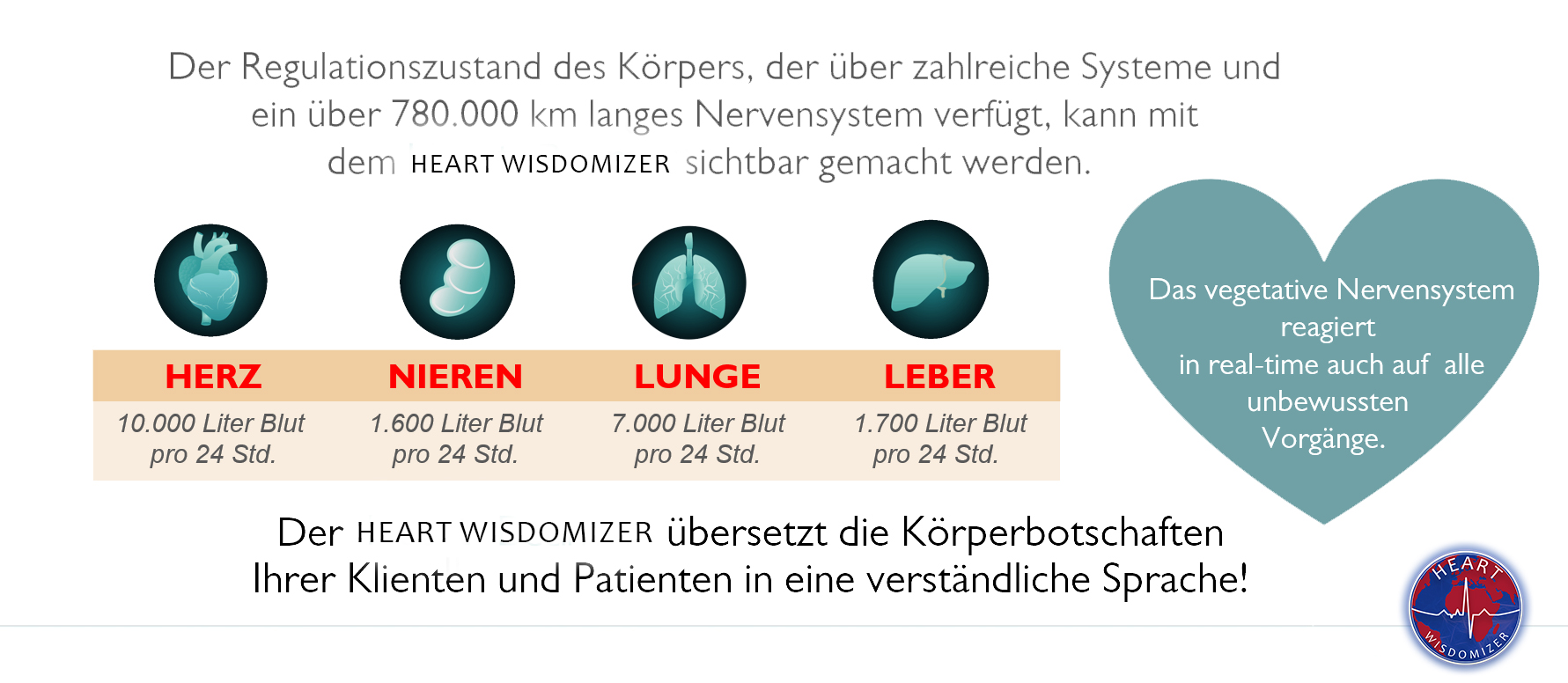 Die HEART-WISDOMIZER HRV-Biofeedback Analyse ist ein zuverlässiges Diagnoseverfahren, um vegetative Dysbalancen festzustellen, die zunehmend zu einer Verminderung der Lebensqualität, zu einer Einschränkung der Leistungsfähigkeit und letztlich zu chronischen Erkrankungen führen. Die HRV gibt Auskunft darüber, wie gut der Körper seinen Funktionen und Aufgaben nachkommen kann und wie die Gesamtkörperregulation funktioniert. Unser Körper vollbringt rund um die Uhr gewaltige Leistungen, die unserem Geist – im Gegensatz zum Herzen – jedoch meist gar nicht bewusst sind. Unser eigenes Herz ist das einzig verlässliche Messinstrument, das uns in real-time Auskunft über unser Wohlbefinden geben kann.